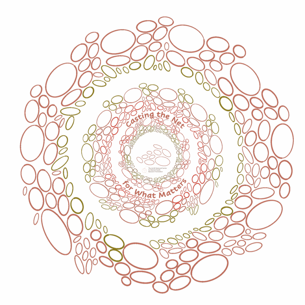 We’re also excited to share our logo for the Casting the Net for What Matters – The ALIVE National Centre Consortium for Equitable Wellbeing and Mental Health Systems Transformation with the artwork created by Muruwori Gumbaynggirr researcher Phillip Orcher.