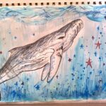 Description: A watercolour drawing of a whale in the deep ocean with stars around it. To me loneliness feels like the deep ocean and the stars, they represent that you can see there is opportunity out there, but they feel so far away and you’re beneath the surface, and out of touch with everything around you. You’re sure that others have these emotions, and you are not alone, but those possibilities feel so far away and it’s hard to connect with that, even though, you know they’re there.