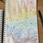 The clear bubble in the bottom left represents an individual going through a journey. The start of the journey is more lonely, represented by the jagged, cool line, and it gets smoother and warmer as time goes on, and you become more integrated into your new environment.
