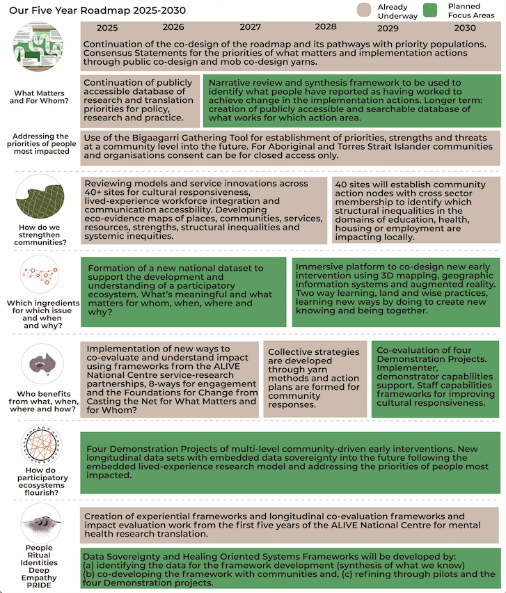 The Consortium is a direct outcome from the Centre’s Call to Action (2024) Casting the Net for What Matters and for Whom to [re]form national mental health and wellbeing using Five Foundations and guided by nine actions for change. The Consortium will expand the ALIVE National Centre’s flagship projects that are shifting the narratives in what community-level prevention is, creating new models to address missed life years with priority populations and to deliver a holistically focused at-scale system of care.